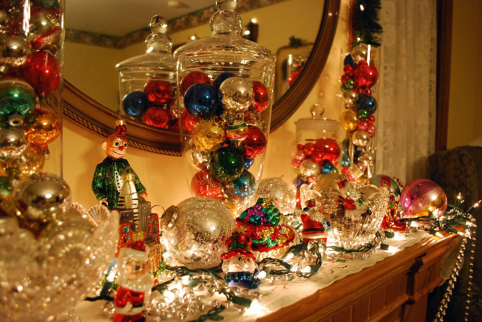I adore vintage ornaments and the mantle holds my collection of old German, Polish and mercury ornaments. The mantle just glows!!